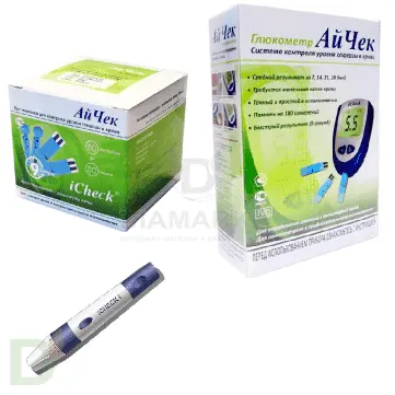 <p> При покупке тест-полосок ланцеты прилагаются<strong> бесплатно</strong>: по 1 ланцету на тест-полоску. Это позволяет значительно экономить. </p> <p> Работать с глюкометром iCheck очень легко и удобно. Достаточно лишь 0,9 мкл крови, чтобы он в течение нескольких секунд показал результат. Данная модель способна не только сохранять результаты измерений, благодаря внутренней памяти, но также с легкостью подсчитывает средний результат за определенный период времени. </p> <p> Рекомендуем купить глюкометр АйЧек<strong> для пожилых людей</strong>, для них это будет лучшее предложение по самоконтролю диабета. </p> <p> В комплекте с глюкометром АйЧек поставляется чехол, прокалыватель и инструкция. </p> <h2>Что могут Тест-полоски АйЧек (iCheck)</h2> <ul> <li>предназначены для использования совместно с глюкометром АйЧек (iCheck). Великолепно подходят как для самостоятельного контроля уровня глюкозы в домашних условиях, так и для применения в условиях стационара. Представляют собой отличное предложение бюджетного класса.</li> <li>очень удобны в использовании, они достаточно широкие, благодаря чему их легко доставать из тубуса. Край полоски имеет особую рекреационную зону, при соприкосновении с которой происходит всасывание крови из пальца. Подобное явление происходит благодаря микрокаппилярной диффузии и делает проведение теста еще более комфортным.</li> <li>позволяют электрохимическим способом определить уровень сахара. Калибровка результатов происходит по цельной капиллярной крови. Для проведения теста достаточно капли объемом 0,9 мкл, кровь для анализа берется из пальца. Время, необходимое для определения количества глюкозы, составляет 9 секунд.</li> <li>способны определять количество сахара в крови в диапазоне 1,7-41,7 Ммоль/л. При этом точность анализа составляет 96%, что является очень хорошим показателем для глюкометров и соответствует требованиям, которые предъявляются к профессиональному оборудованию.</li> </ul> <h3>Цена тест-полосок АйЧек (iCheck)</h3> <p> Еще одно их бесспорное преимущество, которое делает использование глюкометра АйЧек (iCheck) не просто эффективным, но еще и очень экономичным. Кроме того, к каждой упаковке полосок бесплатно прилагаются ланцеты, что позволяет еще больше снизить затраты на диагностику. Тест-полоски АйЧек (iCheck) – отличное качество по доступной цене! </p> <p> Срок годности полосок – 120 дней со дня вскрытия упаковки или 2 года с момента изготовления. Производятся тест-полоски АйЧек (iCheck) в Тайване по лицензии фирмы Диамедикал (Великобритания). </p> <p> Достоинства: </p> <ul> <li>Малое количество крови</li> <li>Удобные для людей со слабым зрением тест-полоски, которые легко доставать из тубуса</li> <li>Время проведения теста всего  9 секунд</li> <li>Память на 180 измерений (с указанием даты и времени проведения теста)</li> <li>Средний результат за 7, 14, 21, 28 дней</li> <li><strong>Пожизненная гарантия</strong></li> </ul> <p> Комплектация: </p> <ul> <li>Глюкометр iCheck</li> <li>Мягкий чехол для переноски</li> <li>Тест-полосоки iCheck- 2х25 штук</li> <li>Автопрокалыватель</li> <li>2х25 ланцетов iCheck для автопрокалывателя</li> <li>Батарейка CR 2032- 3 Вольта</li> <li>Инструкция на русском языке</li> </ul> <br> *Предложение действительно, пока акционный товар имеется в наличии<br> <h2>Примечание</h2> <ul> <li>Глюкометр АйЧек не требует кодировки.</li> <li> Кодирующий стрип отсутствует и выведен из состава принадлежностей глюкометра.</li> <li> Контрольный раствор не входит в ком