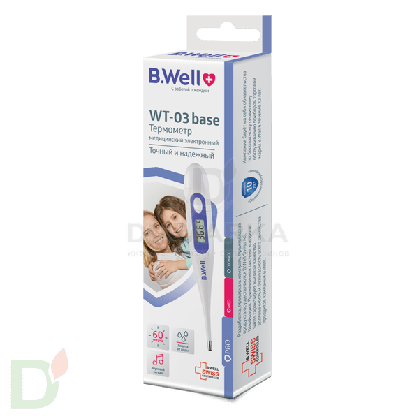 <h2>Автоматический термометр - правильный выбор!</h2> Ртутные термометры уже давно канули в лету. На смену им пришли инфракрасные и электронные девайсы. Такие приборы гораздо более удобны и гигиеничны в применении, а также точны и безопасны! Нет рисков разбить градусник и пораниться осколками или отравиться парами ртути.<br> <br> <h3>Характеристика термометра WT-03 base</h3> <ul> <li>Быстрое и точное измерение за 60 секунд</li> <li> Покажет последнее измерение</li> <li> Термометр сделан из безопасного пластика и не содержит ртути и стекла</li> <li> Термометр не боится воды. Специальные водонепроницаемые вставки защищают прибор от попадания воды внутрь.</li> <li> Звуковой сигнал сопровождает процесс измерения, помогает правильно использовать термометр</li> <li> Специальный сигнал при повышенной температуре</li> <li> Автоотключение экономит заряд батареи</li> <li> Футляр для удобного хранения</li> <li> Для дома и медицинских учреждений</li> </ul> <h3>Комплектация</h3> Термометр<br> Элемент питания (батарейка)<br> Защитный футляр<br> Гарантийный талон<br> Инструкция по эксплуатации