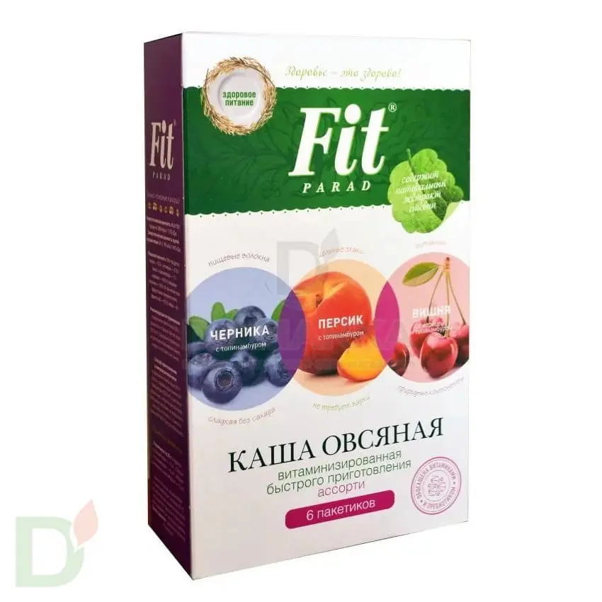 Каша "ФитПарад" овсянная Ассорти "Черника, персик, вишня" 6 пакетиков.